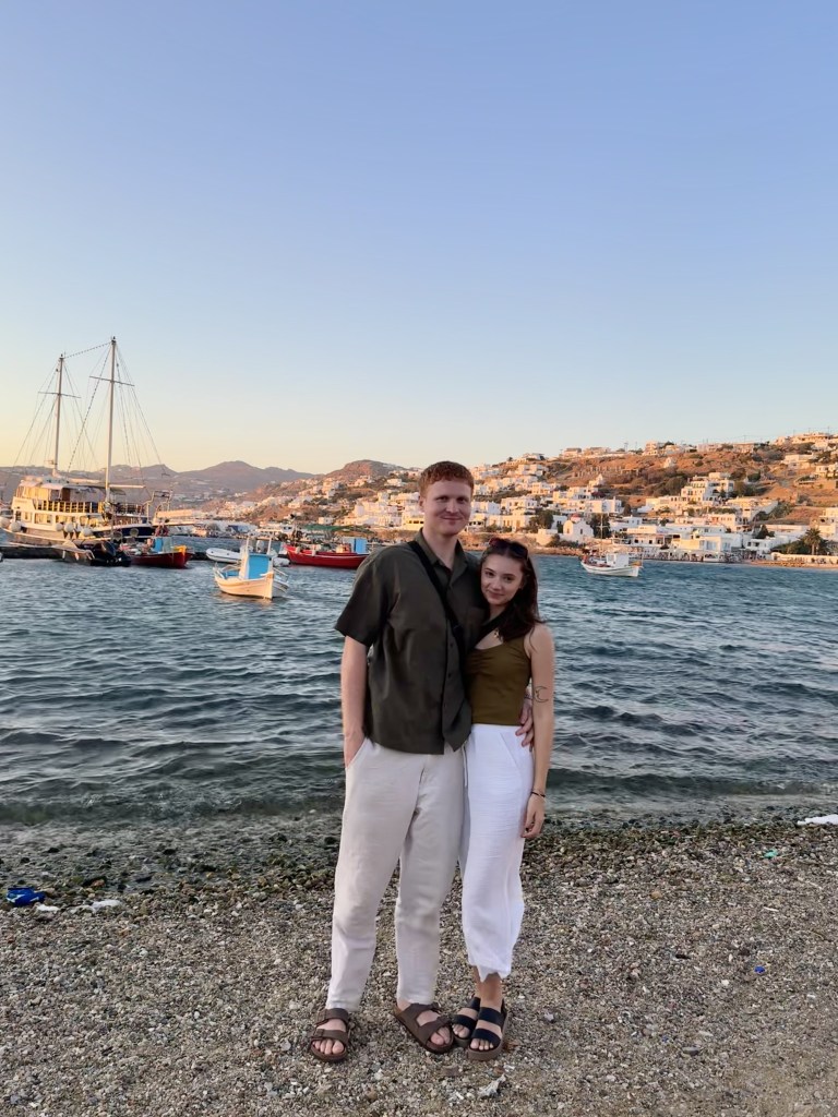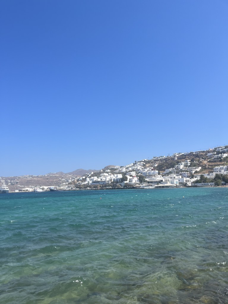 Our first full day in Mykonos, we enjoyed a slow morning having breakfast, exploring the town, and eventually changing into our swimsuits to go for a swim. Caleb, growing up close to the ocean which allowed him to become a very strong swimmer, laughed (and maybe cringed a little) watching me doggy-paddle in circles around the shallow areas.