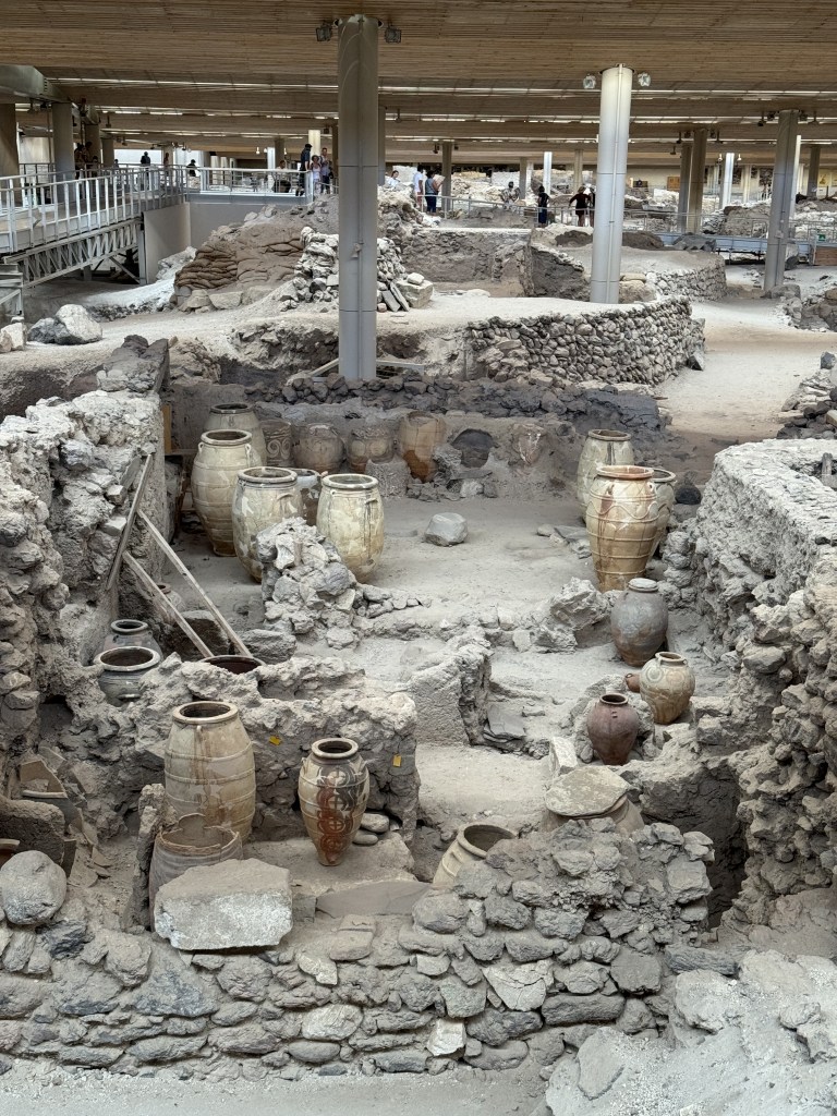 Our first stop on our tour was visiting Akrotiri in Thera, a prehistoric Minoan archeology site. Our guide, Penny, was a full-time archeologist and part-time fashionista (she talked passionately about this site while wearing the most colorful sundress I had ever seen). We walked through the excavated ruins learning about the people who inhabited it, their labor, and common spaces. The people of this town abandoned their homes after a series of earthquakes and not long after a volcano erupted. It’s widely debated among archeologists where these people fled to.